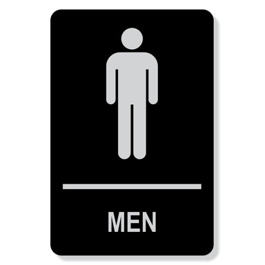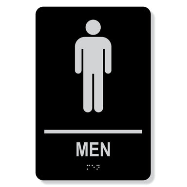 6" x 9" Men washroom sign Black non glare finish with silver tactile text Tactile text and pictogram with Grade 1 Braille option Made to Canadian ...