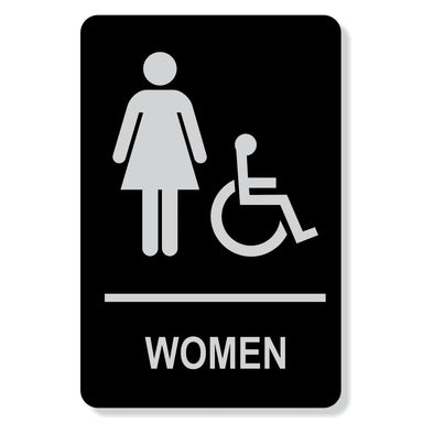 6x9 Womens accessible washroom sign Black Non glare finish with Silver tactile text Tactile text and pictogram with Grade 1 Braille Made to Canadi...