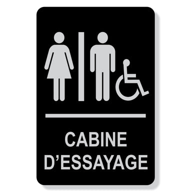 6" x 9" CABINE D'ESSAYAGE sign Black non glare finish with Silver tactile text Tactile text and pictogram with Grade 1 Braille option Made to Cana...