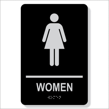6" x 9" Women washroom sign Black non glare finish with Silver tactile text Tactile text and pictogram with Grade 1 Braille option Made to canadia...