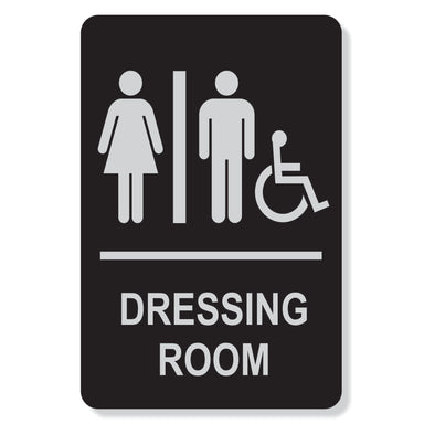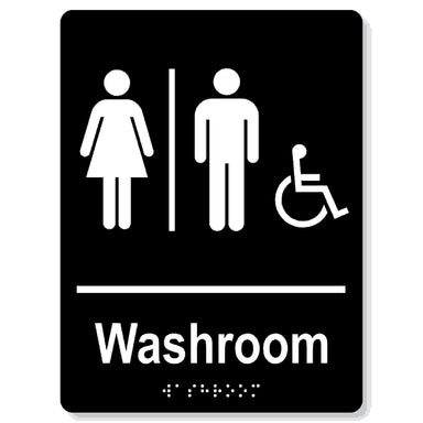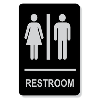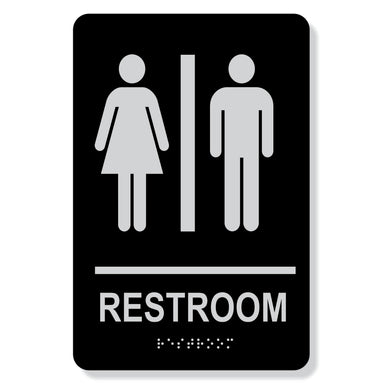 6" x 9" Restroom sign Black non glare finish with Silver tactile text Tactile text & pictogram with Grade 1 Braille option Made to Canadian St...