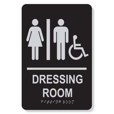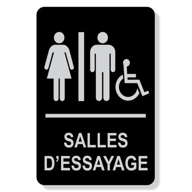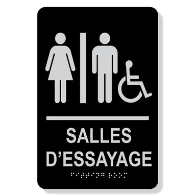6" x 9" SALLES D'ESSAYAGE sign Black non glare finish with Silver tactile text Tactile text and pictogram with Grade 1 Braille option Made to Cana...
