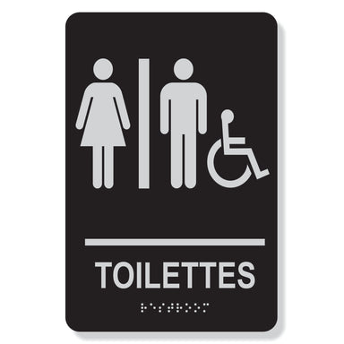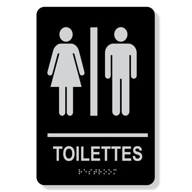 6" X 9" Toilettes sign Black non glare finish with silver tactile text Tactile text and pictogram with Grade 1 Braille option Made to Canadian Sta...