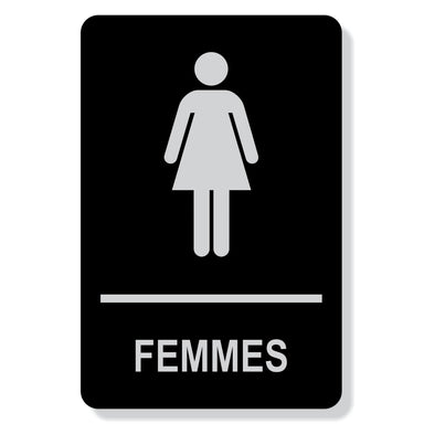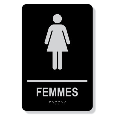 6" x 9" FEMMES sign Black non glare finish with Silver tactile text Tactile text and pictogram with Grade 1 Braille option Made to Canadian standa...